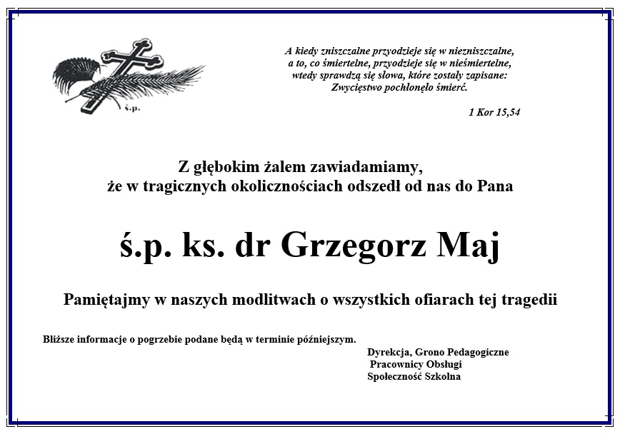 3. W czwartek, 23 kwietnia o godz. 14.00 w parafii rodzinnej w Rokietnicy rozpoczną się uroczystości pogrzebowe. Msza Święta będzie celebrowana w kościele parafialnym pw. św. Mikołaja Bpa, a po niej procesja na miejscowy cmentarz i złożenie ciała śp. ks. Grzegorza w grobie.