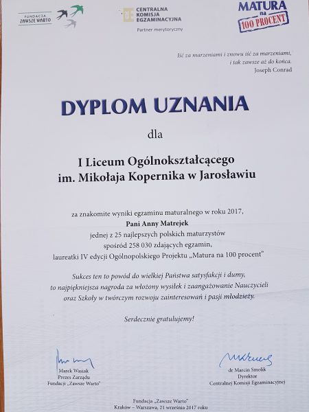21 września 2017 r. w Bibliotece Uniwersyteckiej w Warszawie odbyła się Gala IV edycji Ogólnopolskiego Projektu „Matura na 100%” organizowana przez Centralną Komisję Egzaminacyjną i Fundację „Zawsze warto”. W tym roku spośród 258 030 zdających egzaminy maturalne wyłoniono 25. najlepszych, którym kapituła przyznała tytuł Laureata. W tym prestiżowym gronie znalazła się tegoroczna absolwentka jarosławskiego „Kopernika” Anna Matrejek, która jako jedyna z województwa podkarpackiego znalazła się w tym gronie.