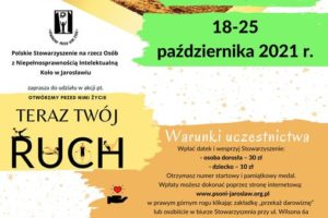 PSONI Koło w Jarosławiu w dniach 18 – 25 października 2021 r. organizuje akcję pn. „Otwórzmy przed Nimi życie – Teraz Twój Ruch”. W tych dniach zapraszamy Państwa do aktywności ruchowej i jednocześnie wsparcia osób z niepełnosprawnością intelektualną, które na co dzień korzystają z naszego Stowarzyszenia przez symboliczną wpłatę. Aby…