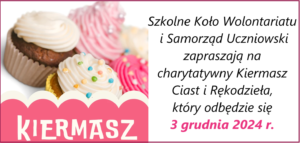 Szkolne Koło Wolontariatu i Samorząd Uczniowski zapraszają na charytatywny Kiermasz Ciast i Rękodzieła, który odbędzie się 3.12.2024 r. (wtorek) po pierwszej lekcji. Wszystkich zainteresowanych, którzy w sposób czynny zechcą zaangażować się w przygotowanie kiermaszu (wypieki, rękodzieło) prosimy o zgłaszanie się do p. Zofii Ciesielskiej i p. Magdaleny Szewczyk. Dochód będzie przeznaczony na SZLACHETNĄ PACZKĘ oraz na MIKOŁAJKI dla dzieci z Regionalnej Placówki Opiekuńczo-Terapeutycznej im. Ks. Mieczysława Lisińskiego w Jarosławiu. Serdecznie zapraszamy do udziału w akcji.