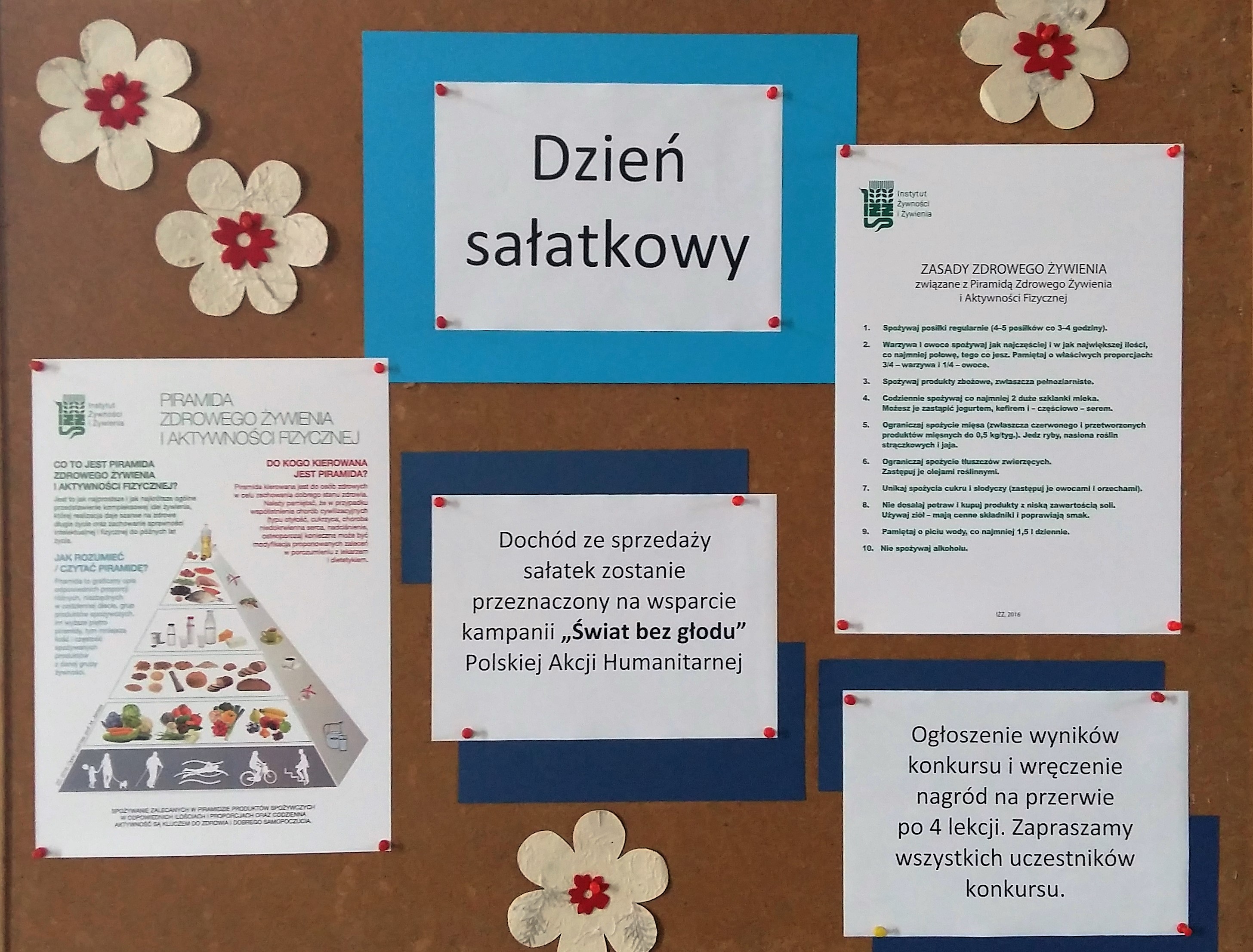 W dniu 19.04.2016 w naszej szkole zorganizowano „Dzień sałatkowy”. Konkurs na najlepszą sałatkę, jak co roku połączony jest ze sprzedażą, z której dochód przeznaczany jest na kampanię „Świat bez głodu” Polskiej Akcji Humanitarnej. Do konkursu przystąpiło 10 uczniów oraz 5 nauczycieli. Najlepsze wg. jury sałatki to: w kategorii nauczycieli Pani Katarzyny Kuźniar-Jabłońskiej, w kategorii uczniów I miejsce przypadło uczennicy z kl. 3b Natalii Surmacz, II i III miejsce zdobyła Katarzyna Bednarz z kl. 1c. Ponadto jury wyróżniło sałatkę Klaudii Czepiel z kl. 3b. Zwycięzcy zostali nagrodzeni przez organizatorów konkursu. Ze sprzedaży sałatek uzyskano kwotę w wysokości 240 złotych. Serdecznie dziękujemy wszystkim uczestnikom „Dnia sałatkowego”. Zapraszamy na kolejne edycje 🙂