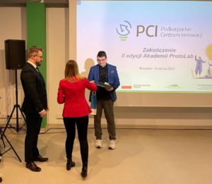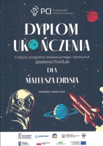 Z przyjemnością pragniemy poinformować, że uczeń klasy 3g Mateusz Dryś ukończył II edycję programu edukacyjnego i konkursu „Akademia ProtoLab” zorganizowanego przez Podkarpackie Centrum Innowacji.