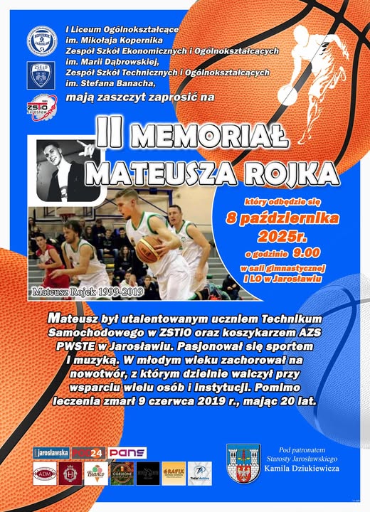 I Liceum Ogólnokształcące im. Mikołaja Kopernika w Jarosławiu, Zespół Szkół Ekonomicznych i Ogólnokształcących im. Marii Dąbrowskiej oraz Zespół Szkół Technicznych i Ogólnokształcących im. Stefana Banacha w Jarosławiu mają zaszczyt zaprosić na II Memoriał Mateusza Rojka. Szczegóły na plakacie.