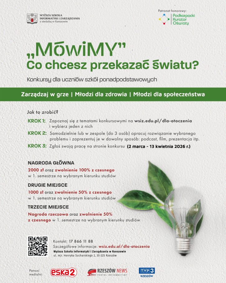Wyższa Szkoła Informatyki i Zarządzania w Rzeszowie zaprasza uczniów szkół ponadpodstawowych do udziału w konkursie pt. „MówiMY – Co chcesz przekazać światu?”. To inicjatywa, która zachęca młodzież do podejmowania ważnych tematów społecznych, zdrowotnych i edukacyjnych, rozwijania kreatywności oraz umiejętności analitycznego i krytycznego myślenia.