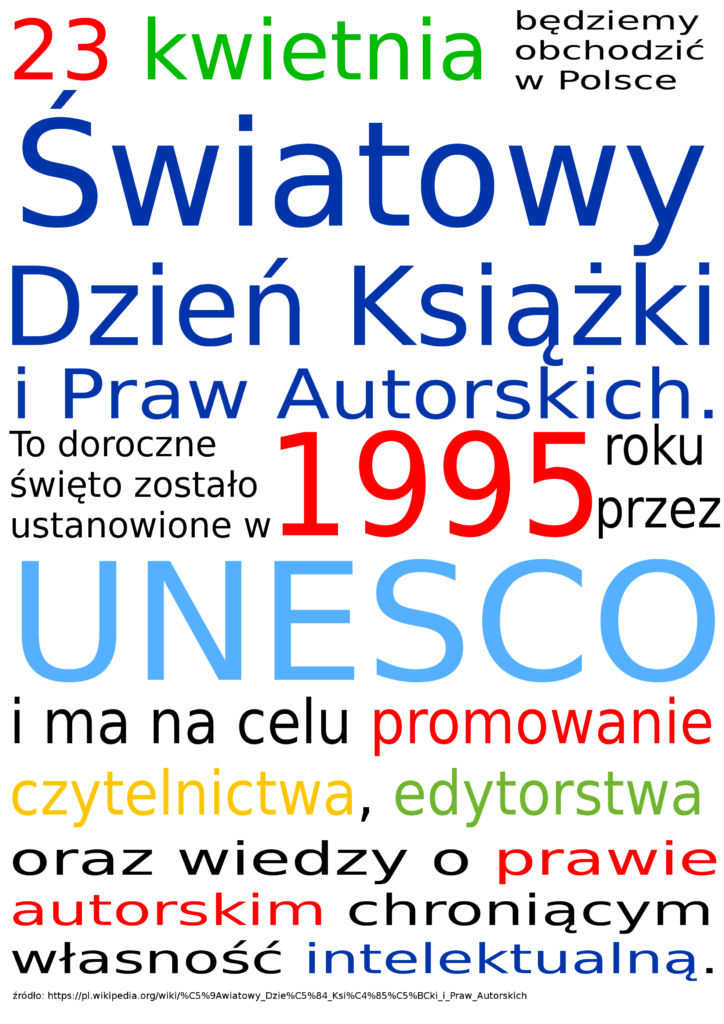 Szczegółowe informacje na temat obchodów Światowego Dnia Książki i Praw Autorskich znajdują się w zakładce Biblioteka poleca.
