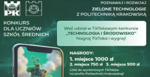 Wydział Inżynierii Środowiska i Energetyki Politechniki Krakowskiej z okazji uruchomienia nowego kierunku studiów 1. stopnia: „EKO-TECHNOLOGIE DLA ZRÓWNOWAŻONEGO ROZWOJU” organizuje konkurs TikTok „TECHNOLOGIA I ŚRODOWISKO”.