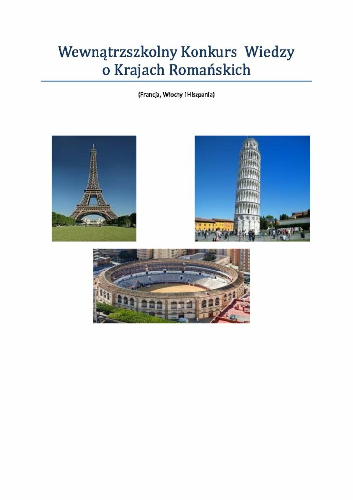 W najbliższym czasie będzie organizowany dla naszej młodzieży Wewnątrzszkolny Konkurs Wiedzy o Krajach Romańskich: Hiszpanii, Francji i Włoszech. Szczegóły konkursu umieszczone są poniżej. Wszystkich chętnych uczniów serdecznie zapraszamy.