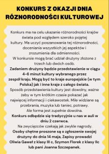 Światowy Dzień Różnorodności Kulturowej, a właściwie Światowy Dzień Różnorodności Kulturowej dla Dialogu i Rozwoju, to coroczne święto obchodzone 21 maja w myśl zasady „tolerancji i poszanowania dla różnorodności kulturowej oraz promocji i ochrony praw człowieka, w tym prawa do rozwoju”. Zostało zainicjowane w 2003 roku przez Zgromadzenie Ogólne ONZ. Z tej okazji w naszej szkole, z inicjatywy Szkolnej Grupy Praw Człowieka zostanie zorganizowany konkurs. Szczegóły na plakacie. Zapraszamy!