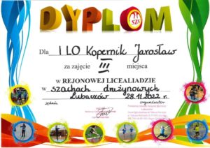 28 listopada w Lubaczowie rozegrane zostały rejonowe zawody w szachach drużynowych. W rywalizacji siedmiu szkół drużyna I Liceum Ogólnokształcącego im. Mikołaja Kopernika w Jarosławiu zajęła III miejsce.