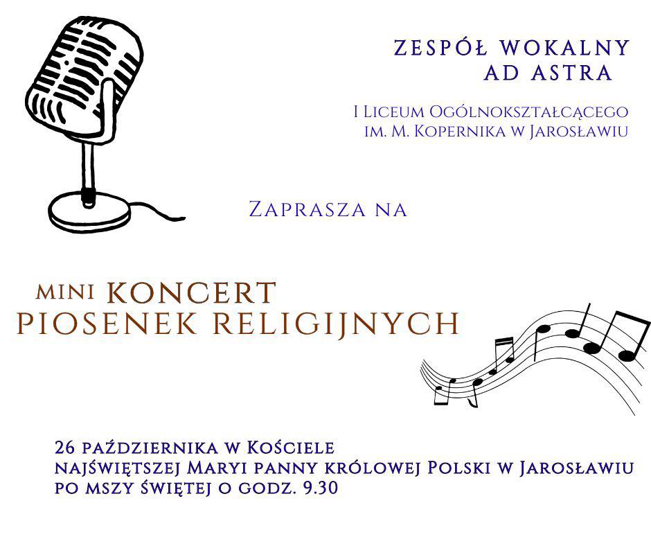 Zespół wokalny AD ASTRA I Liceum Ogólnokształcącego im. Mikołaja Kopernika w Jarosławiu zaprasza na Mini Koncert PIOSENEK RELIGIJNYCH, który odbędzie się 26 października 2025 r. w kościele Najświętszej Maryi Panny Królowej Polski w Jarosławiu po Mszy Św. o godzinie 9.30.