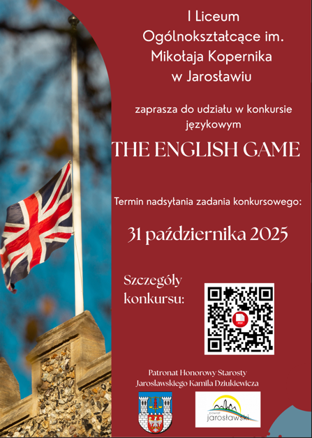 I Liceum Ogólnokształcące im. Mikołaja Kopernika w Jarosławiu serdecznie zaprasza uczniów klas VII i VIII szkół podstawowych z terenu powiatu jarosławskiego do udziału w Powiatowym Konkursie Języka Angielskiego „The English Game” pod patronatem Starosty Jarosławskiego. Etap szkolny polega na przygotowaniu krótkiego, autorskiego filmu w języku angielskim pt. „24 Hours Offline”, przedstawiającego dzień nastolatka, który musi zrezygnować z telefonu i internetu. Film (do 150 sekund, format mp4 lub mov) należy przesłać do 31 października 2025 r. na adres: theenglishgame@lo.kopernik. jaroslaw.pl