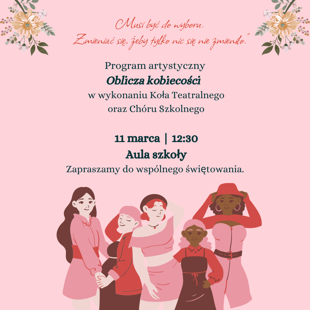 Z okazji Dnia Kobiet w naszej szkole odbędzie się wyjątkowy program artystyczny „Oblicza kobiecości”, przygotowany przez Koło Teatralne oraz Chór Szkolny. Wydarzenie będzie artystyczną refleksją nad różnorodnością kobiecego doświadczenia – nad siłą, wrażliwością, odwagą oraz rolą kobiet w życiu społecznym i kulturze. Poprzez słowo, muzykę i sceniczne interpretacje młodzi artyści spróbują ukazać wielowymiarowość kobiecości oraz jej piękno w codzienności. Uroczystość odbędzie się 11 marca o godzinie 12:30 w auli szkoły. Serdecznie zapraszamy do wspólnego świętowania tego wyjątkowego dnia wraz z naszą szkolną społecznością.