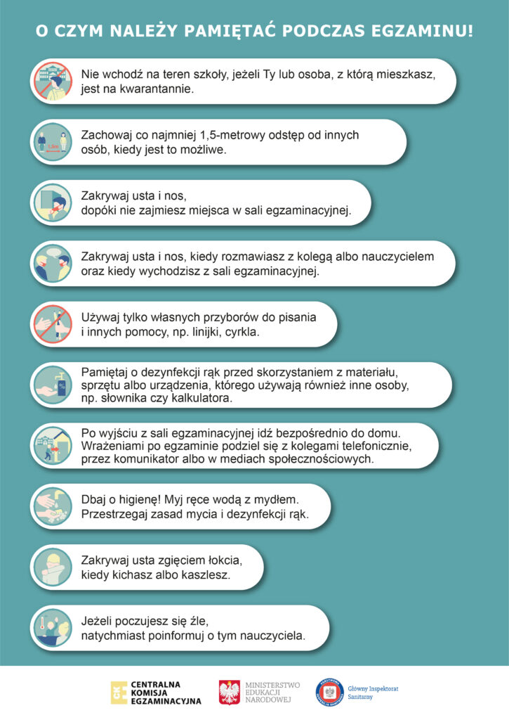 Centralna Komisja Egzaminacyjna, Ministerstwo Edukacji Narodowej oraz Główny Inspektorat Sanitarny przygotowały wytyczne dotyczące organizowania i przeprowadzania egzaminów zewnętrznych: ósmoklasisty, gimnazjalnego, maturalnego, potwierdzającego kwalifikacje w zawodzie oraz zawodowego w 2020 r.