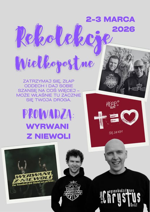 W dniach  2–3 marca 2026 roku, już na początku Wielkiego Postu zapraszamy Cię na wyjątkowe, pełne mocy i świadectwa rekolekcje prowadzone przez Wyrwani Z Niewoli . To czas spotkania z Bogiem, odkrywania wolności serca i doświadczenia Jego miłości, która podnosi z największych trudności. Pozwól Bogu działać w Twoim życiu – On naprawdę może wszystko! Przyjdź tak, jak jesteś. Z Bogiem zawsze można zacząć od nowa. Do zobaczenia!