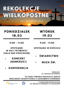 W dniach 18-19 marca 2024 r. w kościele N.M.P. Królowej Polski odbędą się Rekolekcje Wielkopostne dla młodzieży I Liceum Ogólnokształcącego im. Mikołaja Kopernika w Jarosławiu.