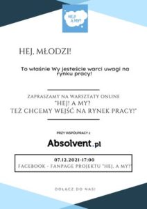 W najbliższy wtorek 07.12.2021 r. o godzinie 17:00 odbędą się warsztaty online “Hej, a my? Też chcemy wejść na rynek pracy”.  Porozmawiamy o tym, jak zaimponować potencjalnym pracodawcom i jak przełamać stereotyp „młody nie jest warty uwagi”. Warsztaty odbędą się przy współpracy z grupą  ABSOLVENT.