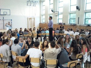 Następnie przyszedł najważniejszy moment wieczoru, czyli rozmowa z naszymi gośćmi. Ciekawym rozwiązaniem okazało się podzielenie nas nie na kilkuosobowe grupy, jak było przy poprzednich wizytach, ale w pary, które ciągle się zmieniały. Już po kilku minutach cała sala gimnastyczna napełniła się śmiechami oraz mieszanką polskiego, angielskiego i hebrajskiego (warto zauważyć, że z roku na rok uczniowie naszej szkoły coraz swobodniej porozumiewają się z obcokrajowcami). Nie było żadnym zaskoczeniem, że życie młodych Żydów nie różni się specjalnie od naszego, choć kilka tematów – np. służby wojskowej czy religii – wywoływało zdumione spojrzenia z obu stron.