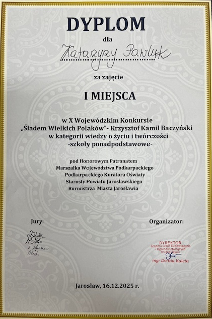 Żołnierz, poeta, czasu kurz tak pisał o sobie bohater X Wojewódzkiego Konkursu Śladem Wielkich Polaków Krzysztof Kamil Baczyński. Jego przejmujące wiersze pełne tragicznej prawdy o życiu pokolenia dorastającego w cieniu wojny znają wszyscy już od szkoły podstawowej. 16 grudnia jego biografia i niezwykła twórczość była tematem zmagań uczniów biorących udział w X jubileuszowej edycji konkursu organizowanego przez Zespół Szkół Budowlanych i Ogólnokształcących im. Króla Kazimierza Wielkiego w Jarosławiu. Miło nam ogłosić, że po raz trzeci z rzędu konkurs w kategorii wiedzy o życiu i twórczości wygrała uczennica klasy 4E Katarzyna Pawluk. W tej samej kategorii wyróżnienie uzyskała uczennica klasy 2E Dominika Biały. Także wyróżnienie, tylko w kategorii recytacja, otrzymała Helena Pawluk. Serdecznie gratulujemy sukcesu!