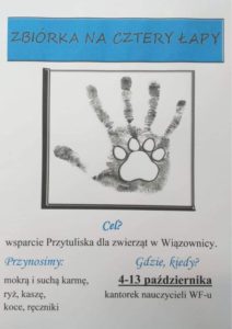 Szkolne Koło Wolontariatu zachęca wszystkich do zorganizowania pomocy dla Przytuliska dla zwierząt w Wiązownicy. Zbieramy mokrą oraz suchą karmę, ryż, kaszę oraz koce, ręczniki i różne zwierzęce akcesoria. Wszystkie produkty prosimy przynosić od 4 do 13 października do kantorka nauczycieli wychowania fizycznego.